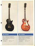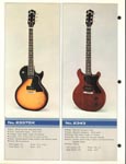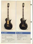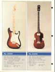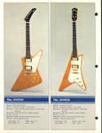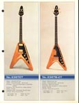 This is a classic catalog and one of the last catalogs to feature all "copy" style guitars. Ibanez had already begun to move away from copy designs in 1976. This catalog is a classic for one big reason: It features the "Korina Triplets": Copies of the Gibson Flying V, Explorer and Moderne, all made with a Korina-style wood and natural yellowed finish. (The wood is actually a Japanese "sen" and not real Korina.) These are three gorgeous guitars. The V is called the Rocket Roll Sr. (model 2387CT), the Explorer is called the Destroyer (model 2459) and the Moderne is a model 2469. All three feature set necks, dot inlays and Super 70 pickups.